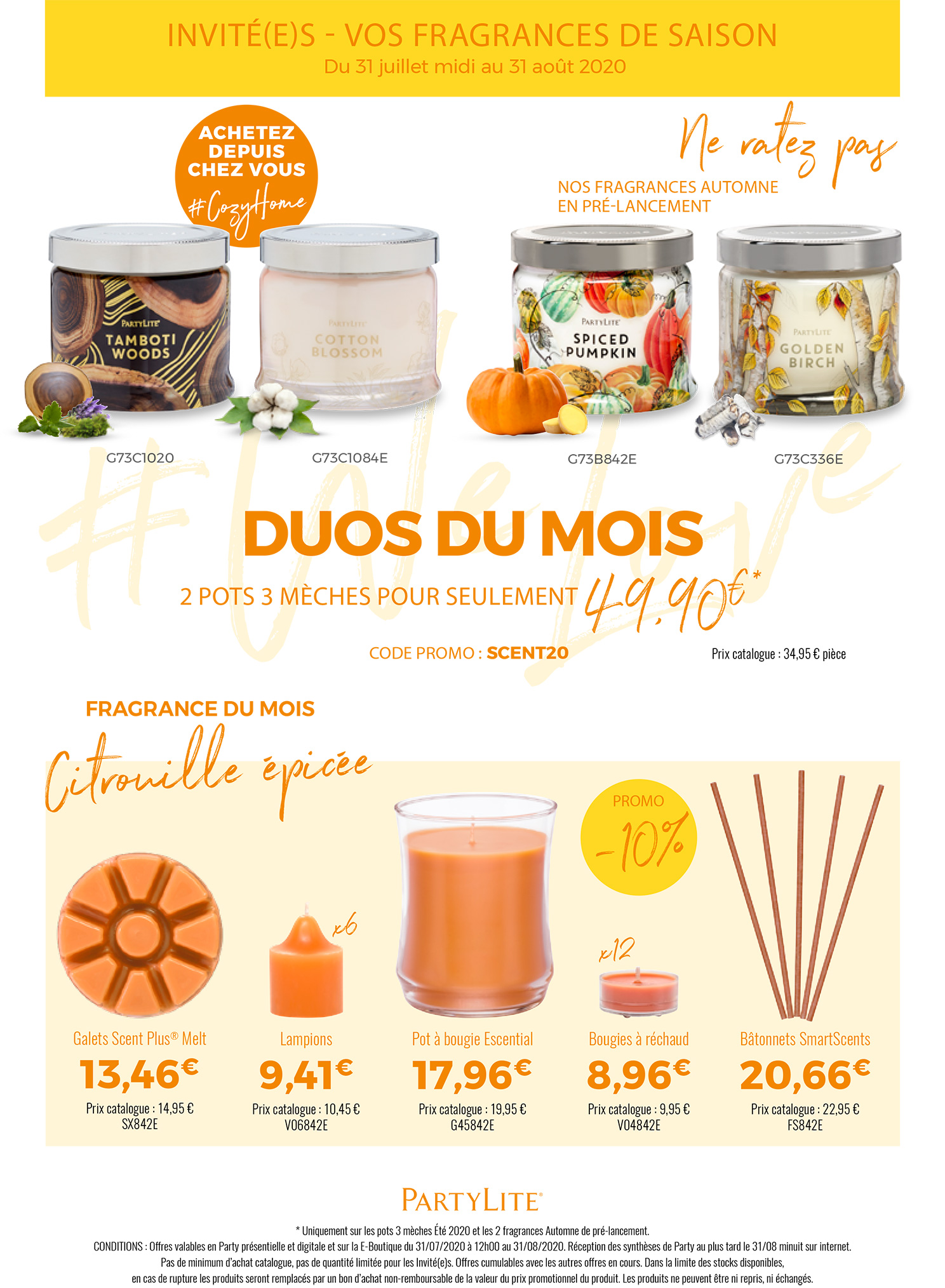 Du 31 juillet au 31 août, profitez d’une offre sur deux nouveautés du prochain catalogue Partylite automne 2020, Citrouille épicé, de couleur orange, idéal pour Halloween ! Et Bouleau doré, un parfum très apprécié pour l’hiver.